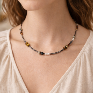 29,00 €Ursprünglicher Preis war: 29,00 €25,00 €Aktueller Preis ist: 25,00 €.Diese handgefertigte Kette vereint natürliche Edelsteine mit einem zeitlosen, modernen Design. Die harmonische Kombination aus Hämatit, Tigerauge, Dalmatiner Jaspis, schwarzen Perlen und warm schimmernden Glasakzenten verleiht dem Schmuckstück eine besondere Tiefe und Eleganz. Jede Perle wurde sorgfältig ausgewählt und von Hand aufgefädelt, wodurch jede Kette ein kleines Unikat ist. Der Verschluss besteht aus hochwertigem 18k…
