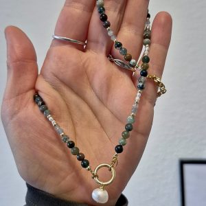 30,00 €Forest Pearl Kette Diese handgefertigte Kette verbindet natürliche Eleganz mit einem ruhigen, erdigen Farbspiel. Die Kombination aus grünen Natursteinperlen und einer schimmernden Süßwasserperle macht dieses Schmuckstück zu einem besonderen Blickfang, der gleichzeitig schlicht und hochwertig wirkt. Die goldenen Elemente bestehen aus 18k vergoldetem Edelstahl und sorgen für einen warmen Kontrast zu den sanften Grün- und…