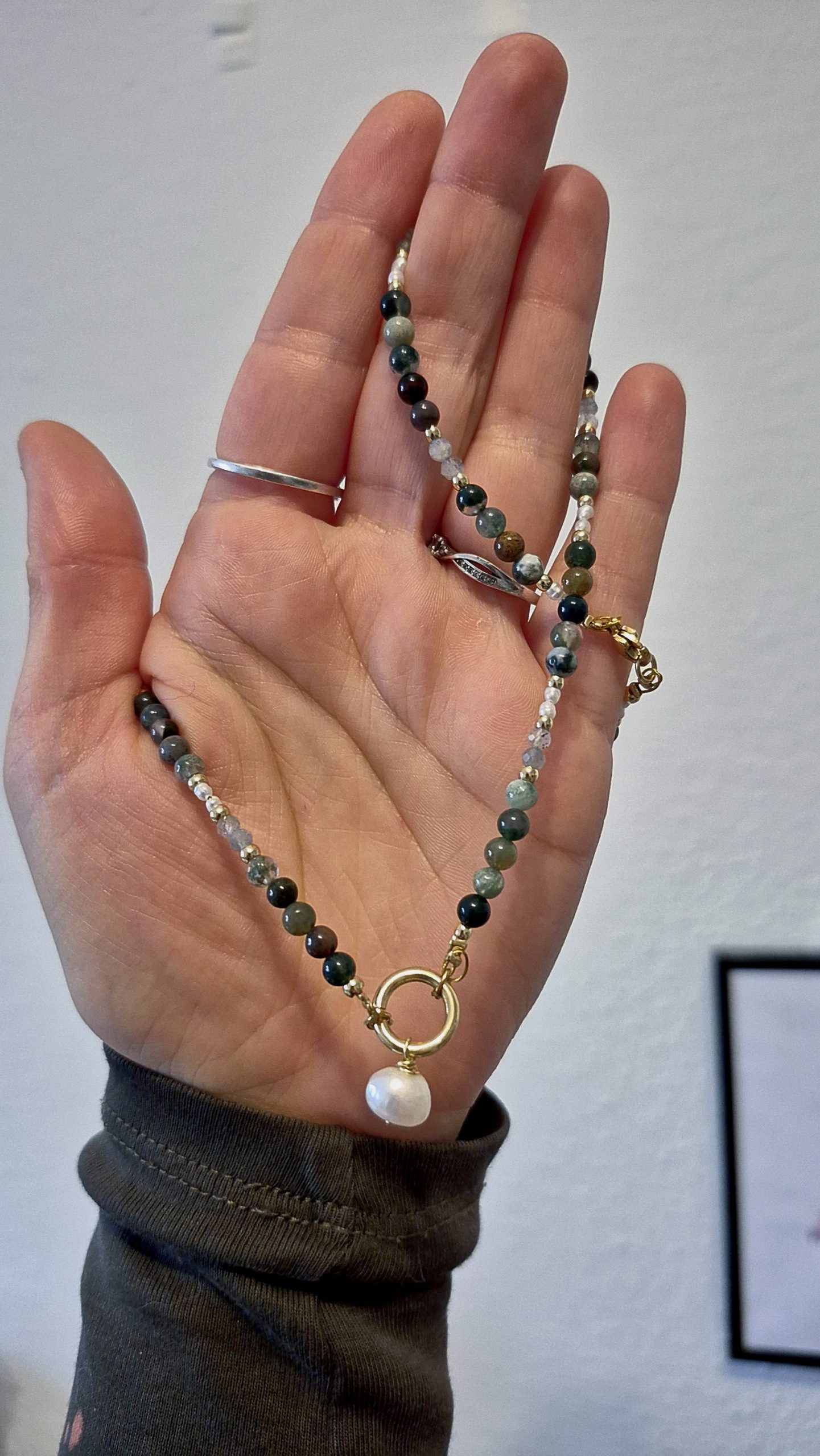 Die goldenen Elemente bestehen aus 18k vergoldetem Edelstahl und sorgen für einen warmen Kontrast zu den sanften Grün- und Naturtönen der Steine. Der runde Verschlussring mit der frei schwingenden Perle verleiht der Kette eine moderne, stilvolle Leichtigkeit.
