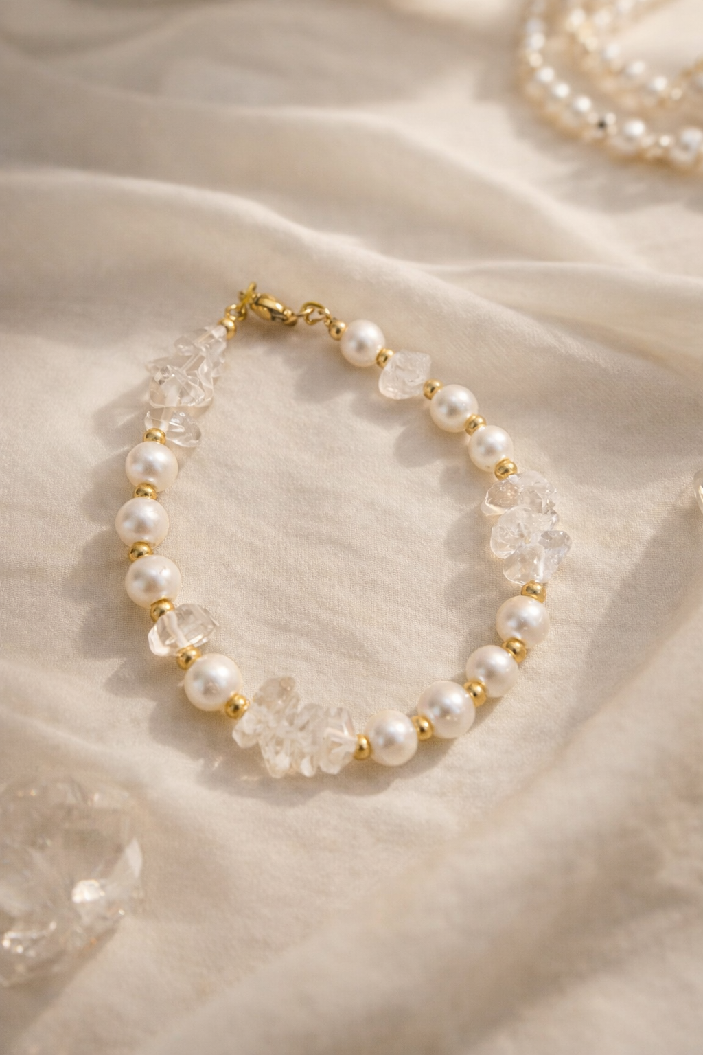 Dieses zarte Armband verbindet schimmernde Perlen mit klaren Bergkristall-Elementen und feinen goldfarbenen Details. Der Bergkristall steht für Klarheit, Leichtigkeit und neue Energie und verleiht dem Schmuckstück eine ruhige, elegante Ausstrahlung. Die Kombination aus natürlichen Formen und sanftem Glanz macht das Armband zu einem zeitlosen Begleiter für jeden Tag.