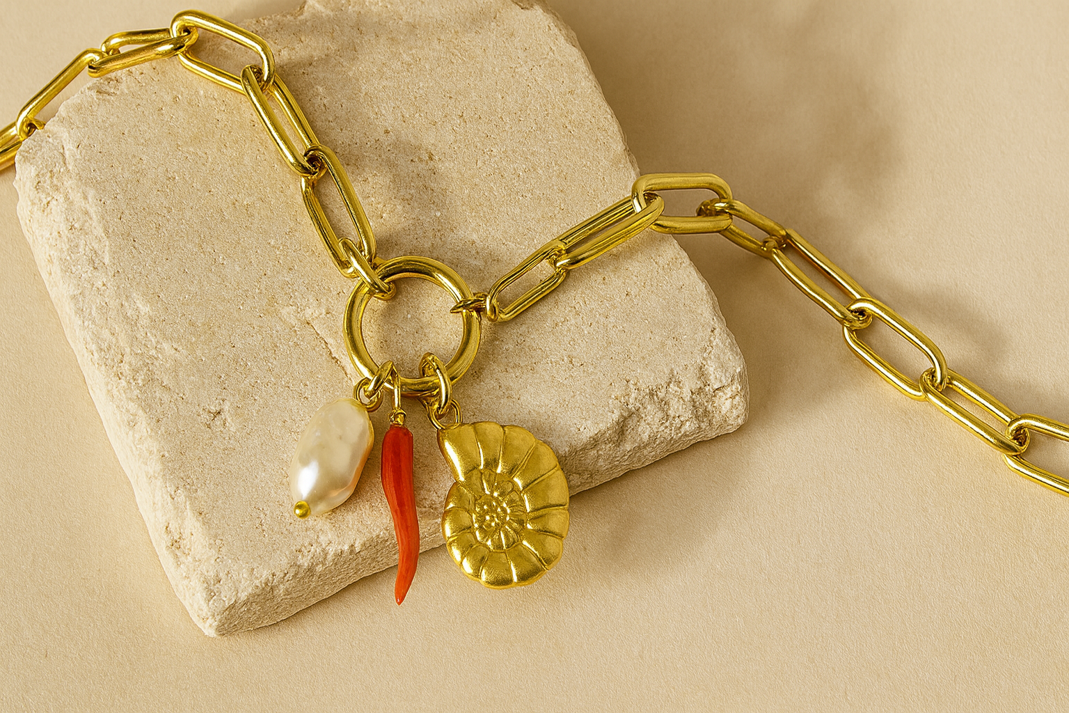 Goldene Gliederkette mit Glücks- & Schutzanhängern