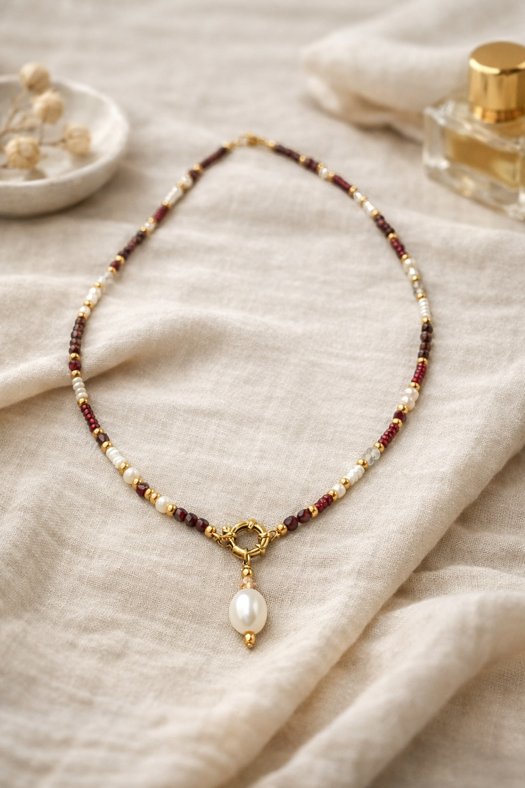 Granat Pearl ist eine feine, handgefertigte Halskette mit tiefer, edler Ausstrahlung. Dunkelroter Granat trifft auf zarte Süßwasserperlen und warme goldene Akzente. Im Mittelpunkt schwebt eine natürliche Tropfenperle, die dem Design eine ruhige, luxuriöse Eleganz verleiht.