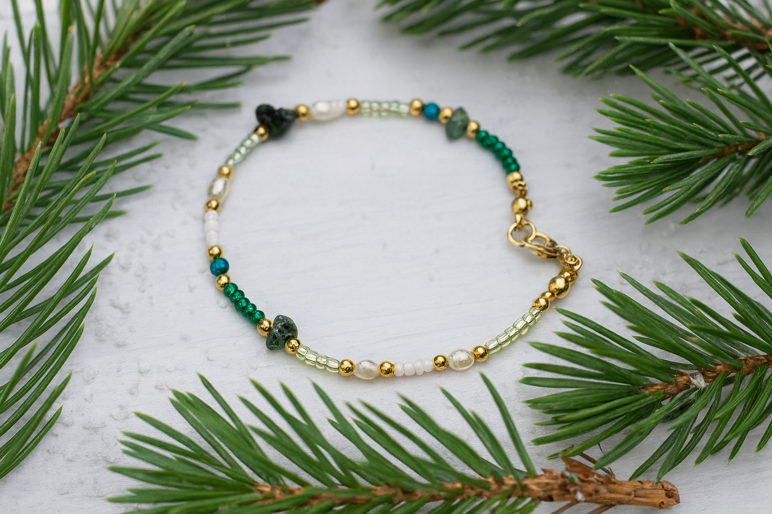 Die zarten Smaragdstein Akzente verleihen diesem Armband einen Hauch von nordischer Magie. Jeder Stein ist ein Naturunikat und bringt seine eigene Struktur und Tiefe mit. In Kombination mit goldfarbenen Details und feinen Perlen entsteht ein elegantes Design, das an klare Bergseen und tiefe Tannwälder erinnert. Perfekt für alle, die schlichte Natürlichkeit lieben und ein besonderes Schmuckstück für jeden Tag suchen. Gefertigt aus 18k vergoldetem Edelstahl, wasserfest und langlebig.