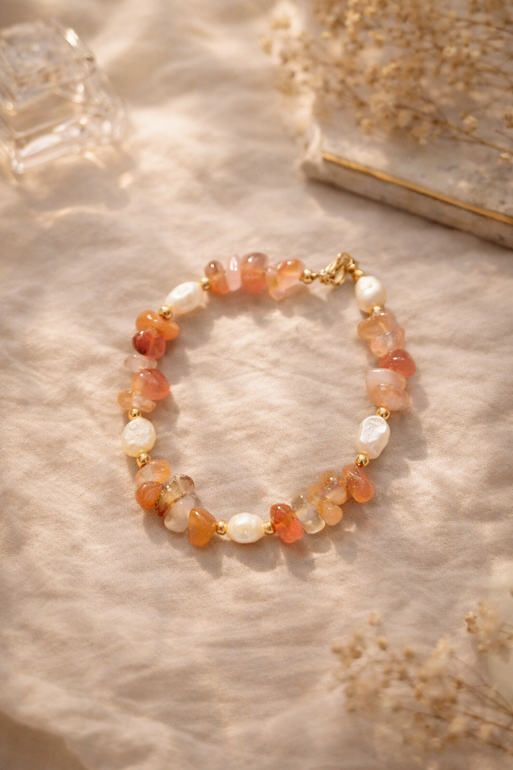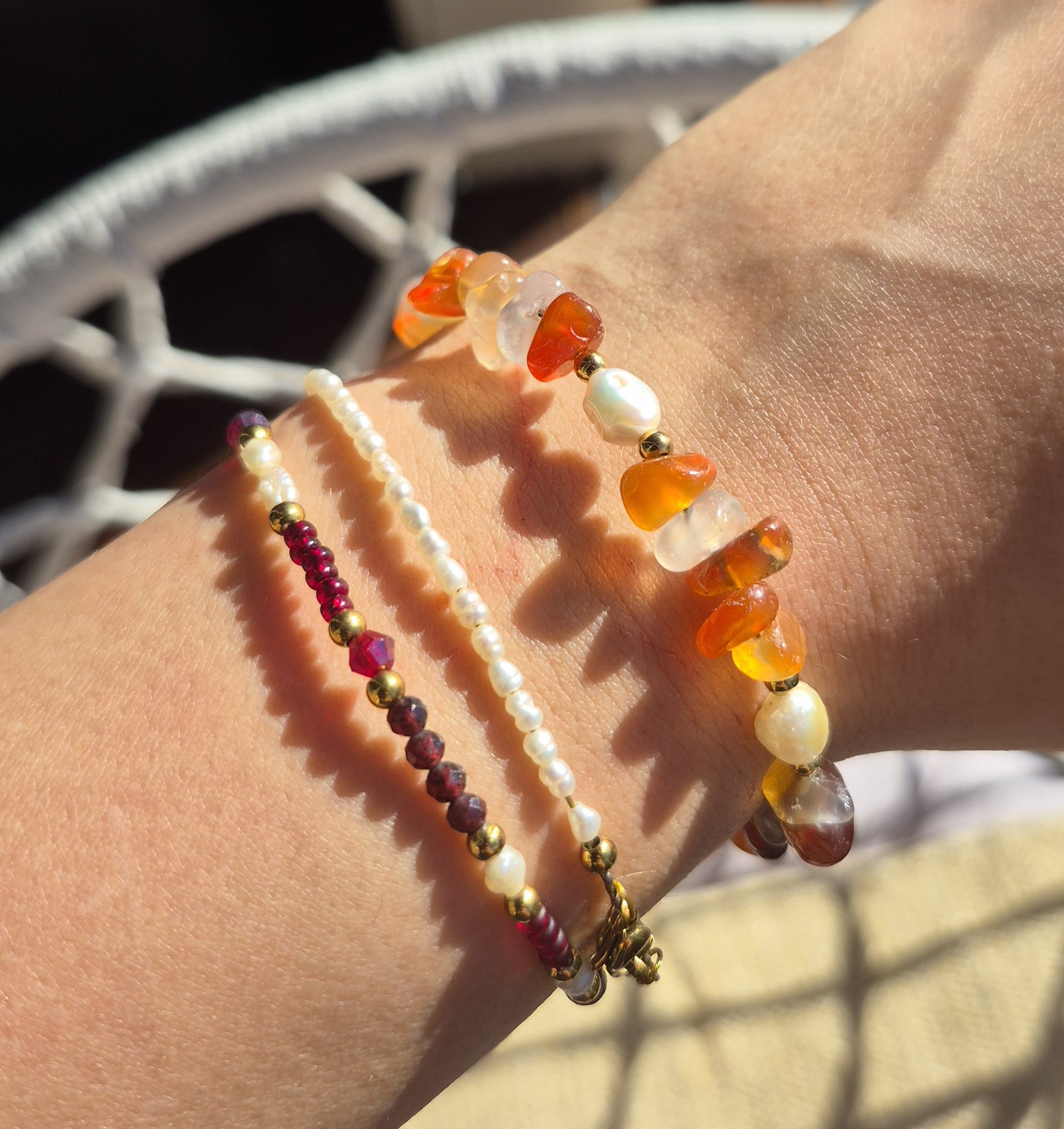 Cirelia vereint warme, strahlende Energie mit natürlicher Eleganz. Das Armband besteht aus intensiv leuchtendem Karneol und echten Süßwasserperlen, kombiniert mit feinen Details aus 18k vergoldetem Edelstahl, wasserfest.