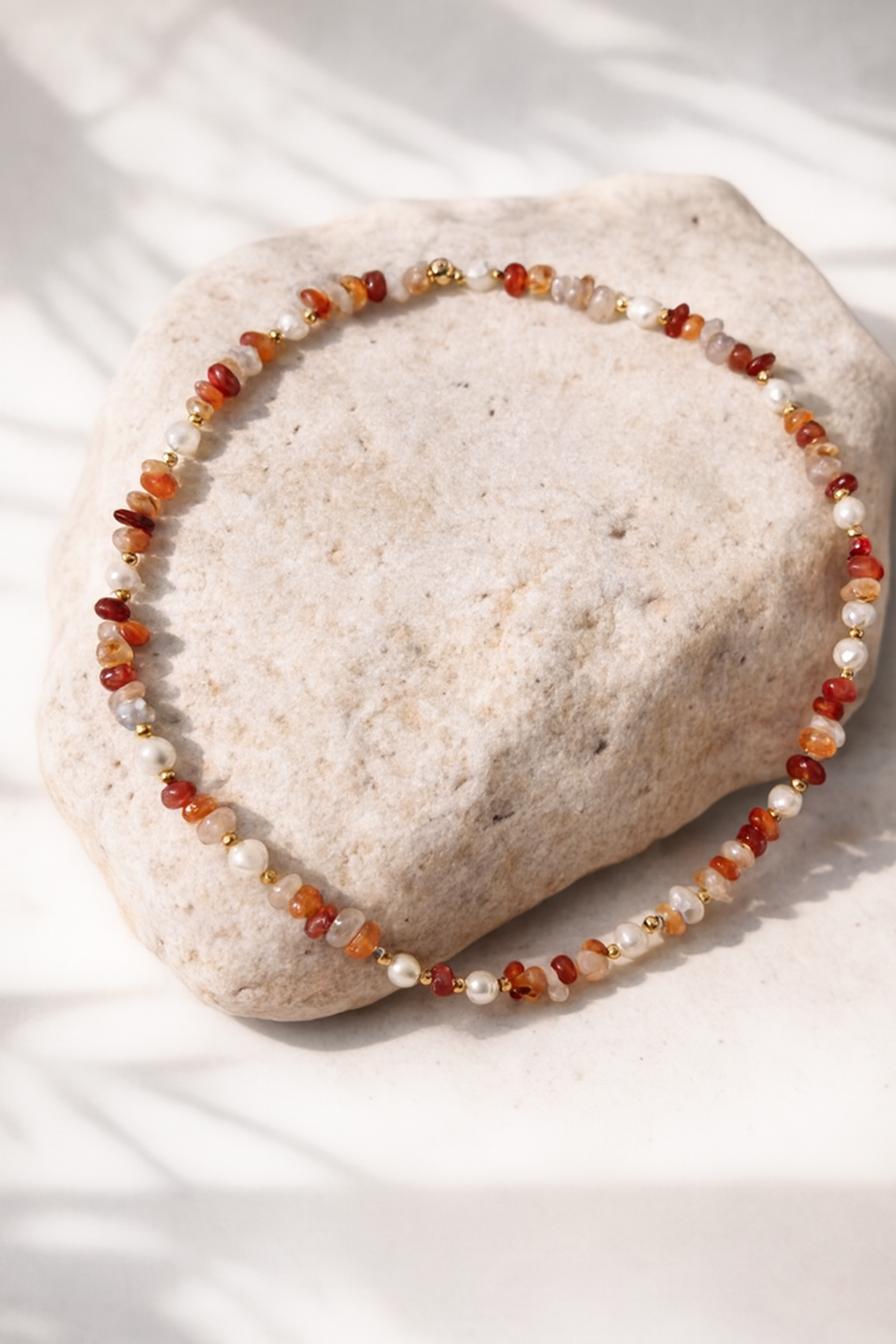 Elanora vereint warmen Karneol und echte Süßwasserperlen zu einem eleganten Schmuckstück voller natürlicher Ausstrahlung. Die intensiven Orangetöne des Karneols erinnern an Sonnenlicht und sanfte Glut, während die Perlen eine weiche, feminine Klarheit hinzufügen. Zwischen goldfarbenen Akzenten aus 18k vergoldetem Edelstahl entsteht ein harmonisches Armband, das Wasserfestigkeit und zeitlose Eleganz verbindet.