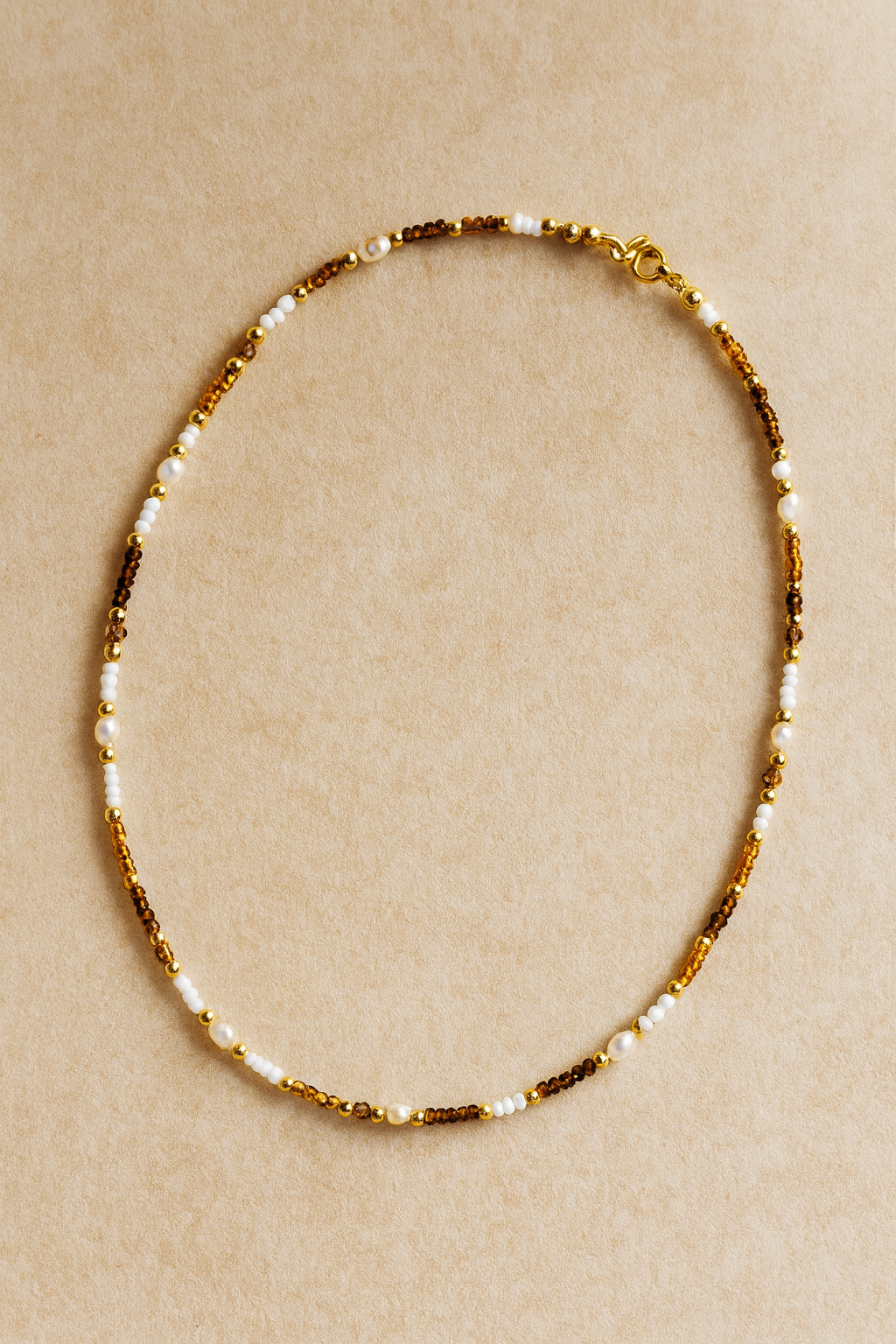 Diese feine Halskette vereint warme Goldtöne mit braunen Akzenten und echten Süßwasserperlen. Die Perlen bringen einen natürlichen Glanz und machen jedes Stück einzigartig. Die Kombination aus hochwertigen Glasperlen, goldenen Details und echten Süßwasserperlen verleiht der Kette eine elegante, warme Ausstrahlung.