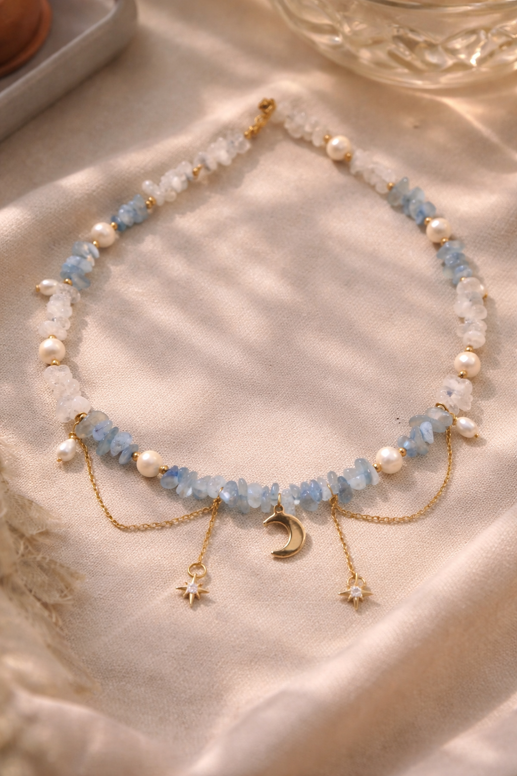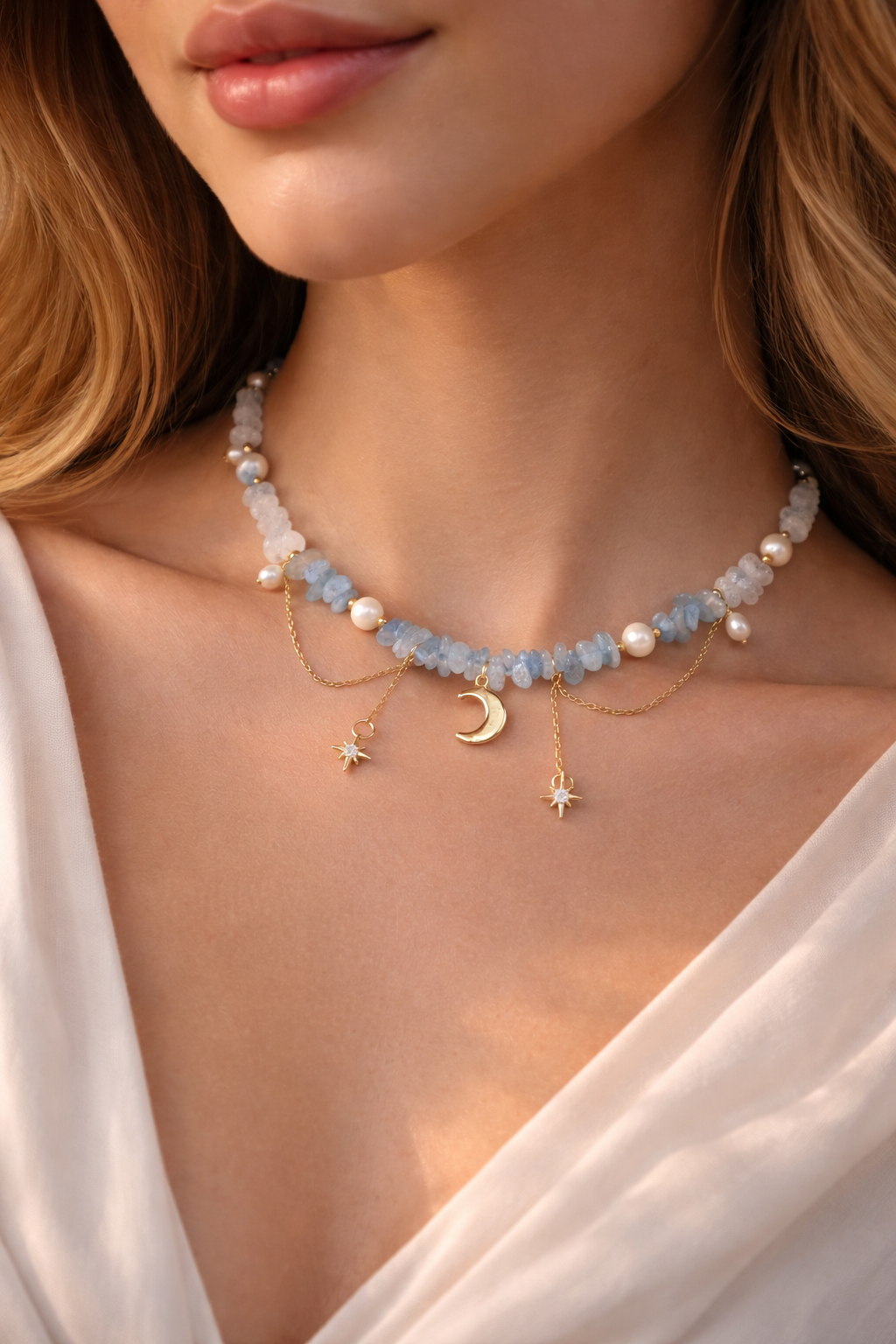 Die Mountain Light Kette steht für Klarheit, Ruhe und inneres Leuchten. Feine Aquamarin Splitter treffen auf reinen Bergkristall und echte Süßwasserperlen. Die goldenen Details mit Mond und Sternen verleihen dem Design eine sanfte, fast magische Ausstrahlung.