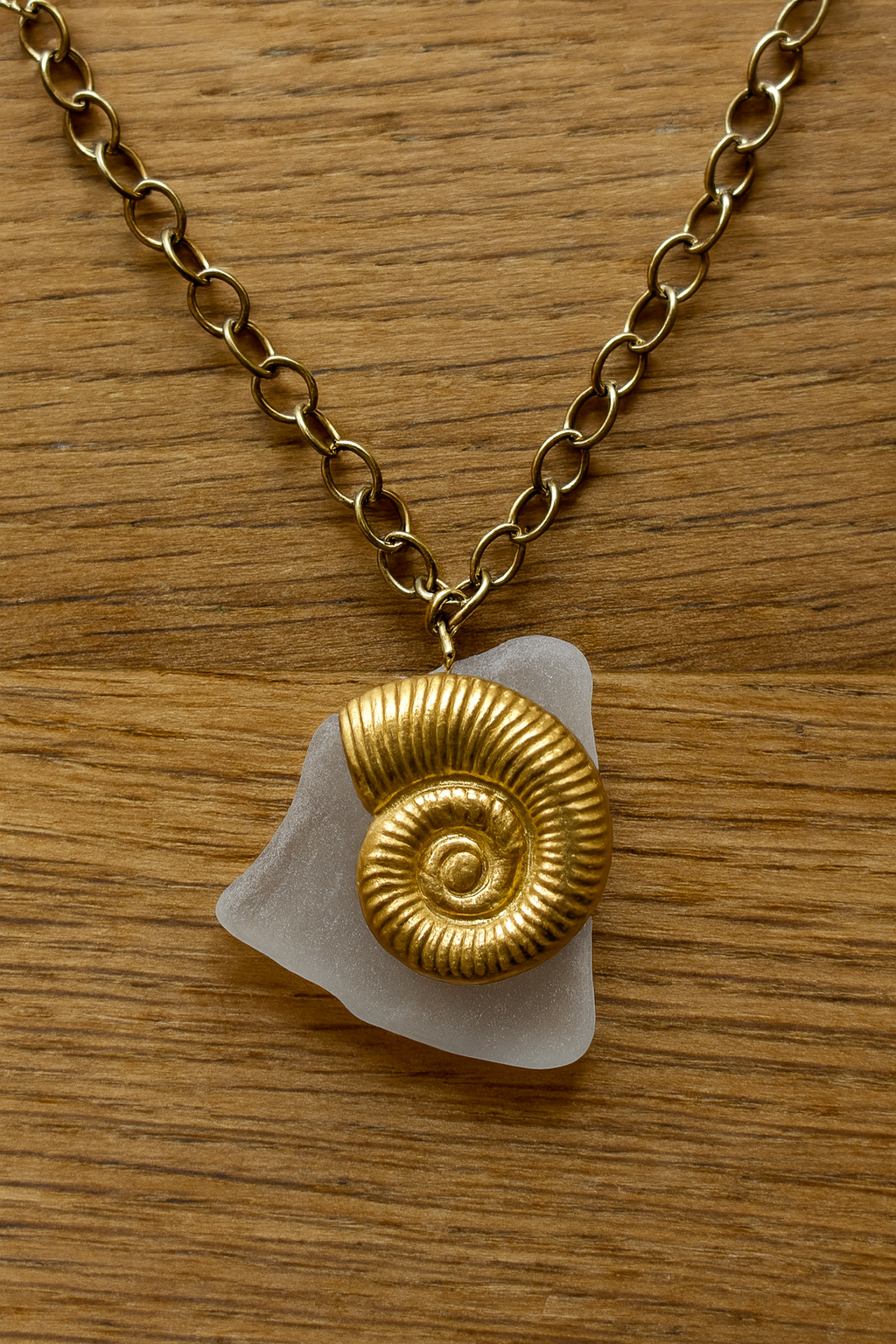 Diese edle Halskette Aurum Spiralis vereint zeitlose Eleganz mit der Magie des Meeres. Der goldene Anhänger in Form einer filigranen Spirale erinnert an die Kraft uralter Ammoniten – ein Symbol für Wachstum, Beständigkeit und den ewigen Kreislauf des Lebens. Der Anhänger ruht auf einem sanft matten Glasstein, der das Licht zart reflektiert und das goldene 18k-Finish besonders strahlen lässt.